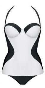 Costum de baie intreg, de la Triumph, cu proprietati usor modelatoare in zona abdominala, avand cupele captusite cu un burete usor si armatura. Bretelele sunt detasabile si se pot pune clasic cu prindere dupa gat sau se pot prinde din mijloc si se inchid tot dupa gat. In partea din spate decolteul este sub linia sutienului cu banda de inchidere in dreptul sutienului pentru a realiza o sustinere cat mai buna.