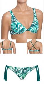 Costum de baie din 2 piese: sutien cu armatura si cupe usoare din materialul costumului de baie, fara captuseala. Maerialul are proprietatea de uscare rapida. Bretelele se inchid la spate clasic sau in X. Slipul are croiala pe jumatate de poponet la spate si este ajustabil in ambele laterale.