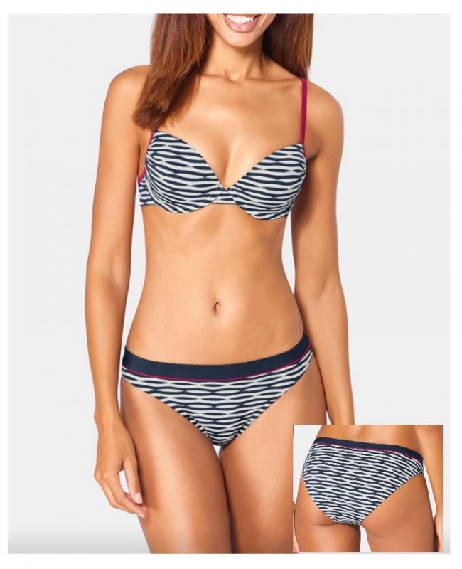 Costum de baie din material cu proprietatea de uscare foarte rapida. Sutien cu armatura, cupe din burete usor pentru a asigura sustinere, confort si o asezare frumoasa a sanului. Slipul are croiala clasica si talie semijoasa.